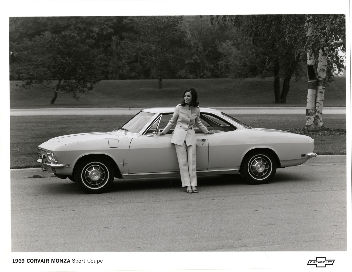 View of woman posing with a 1969 Chevrolet Corvair Monza Sport coupe. Printed on front: "1969 Corvair Monza Sport coupe. Chevrolet." Label on back: "Corvair models for 1969 retain the distinctive styling, which as proved popular with Corvair owners. Available in three models, the Corvair has new interior trim styling, front seat head restraints, fold-down rear seat on Monza Sport coupe (shown above) and safety door armrests designed to shield door handles. The '69 Chevrolets will be in dealer showrooms on September 26. Chevrolet Motor Division, General Motors Building, Detroit, Michigan 48202."