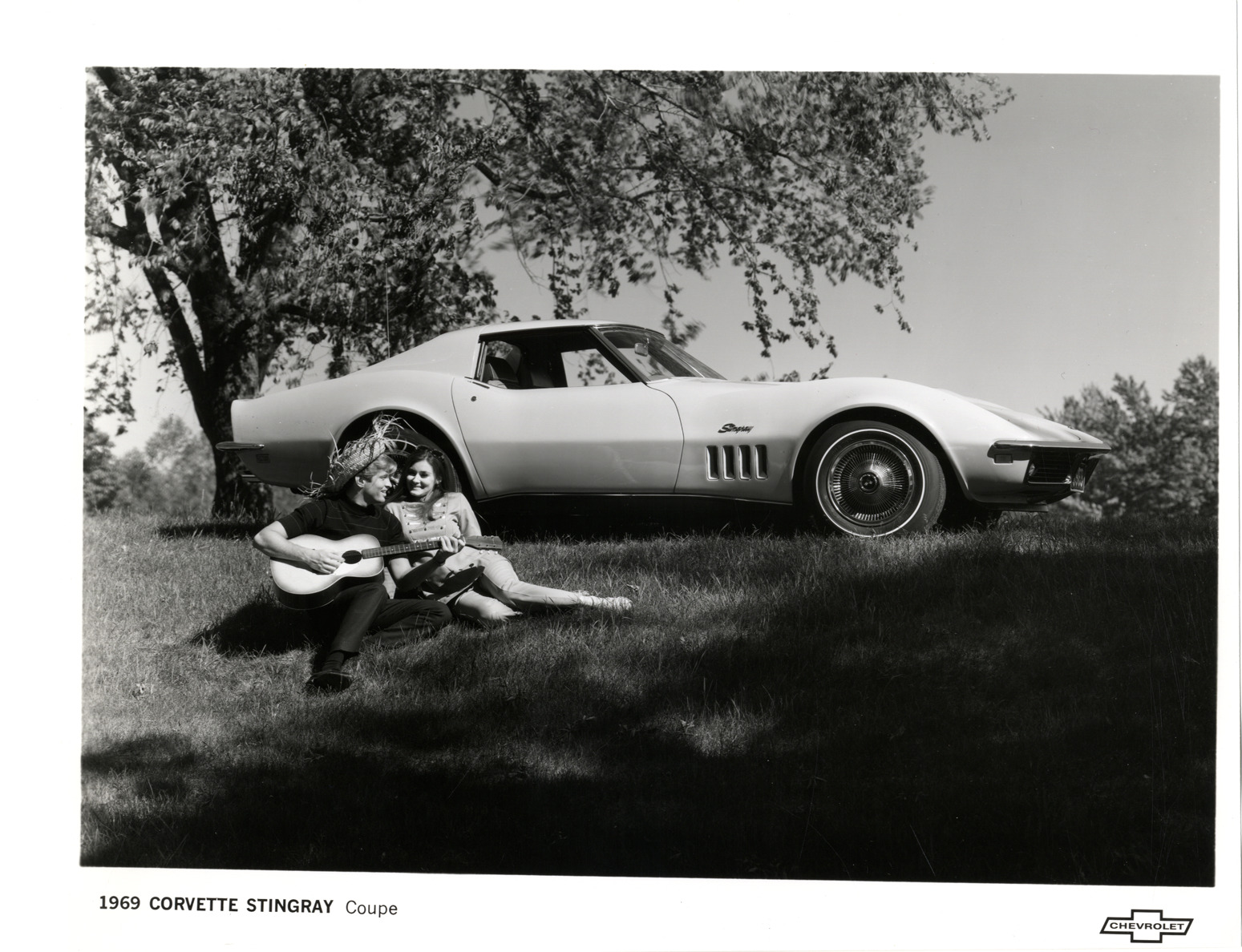 View of a 1969 Chevrolet Corvette Sting Ray coupe. Man and woman with guitar in foreground. Printed on front: "1969 Corvette Stingray coupe. Chevrolet." Label on back: "Continental and dramatic styling of the Corvette Stingray coupe has been retained for 1969. Many new features such as new concealed outside door latches, black grille, built-in headlight washers, anti-theft lock system and new map pocket enhance the comfort and convenience of America's only production-built sports car. The '69 Corvette is also available as a convertible as well as the coupe shown above. All Chevrolet passenger cars will be on display September 26. Chevrolet Motor Division, General Motors Building, Detroit, Michigan 48202."