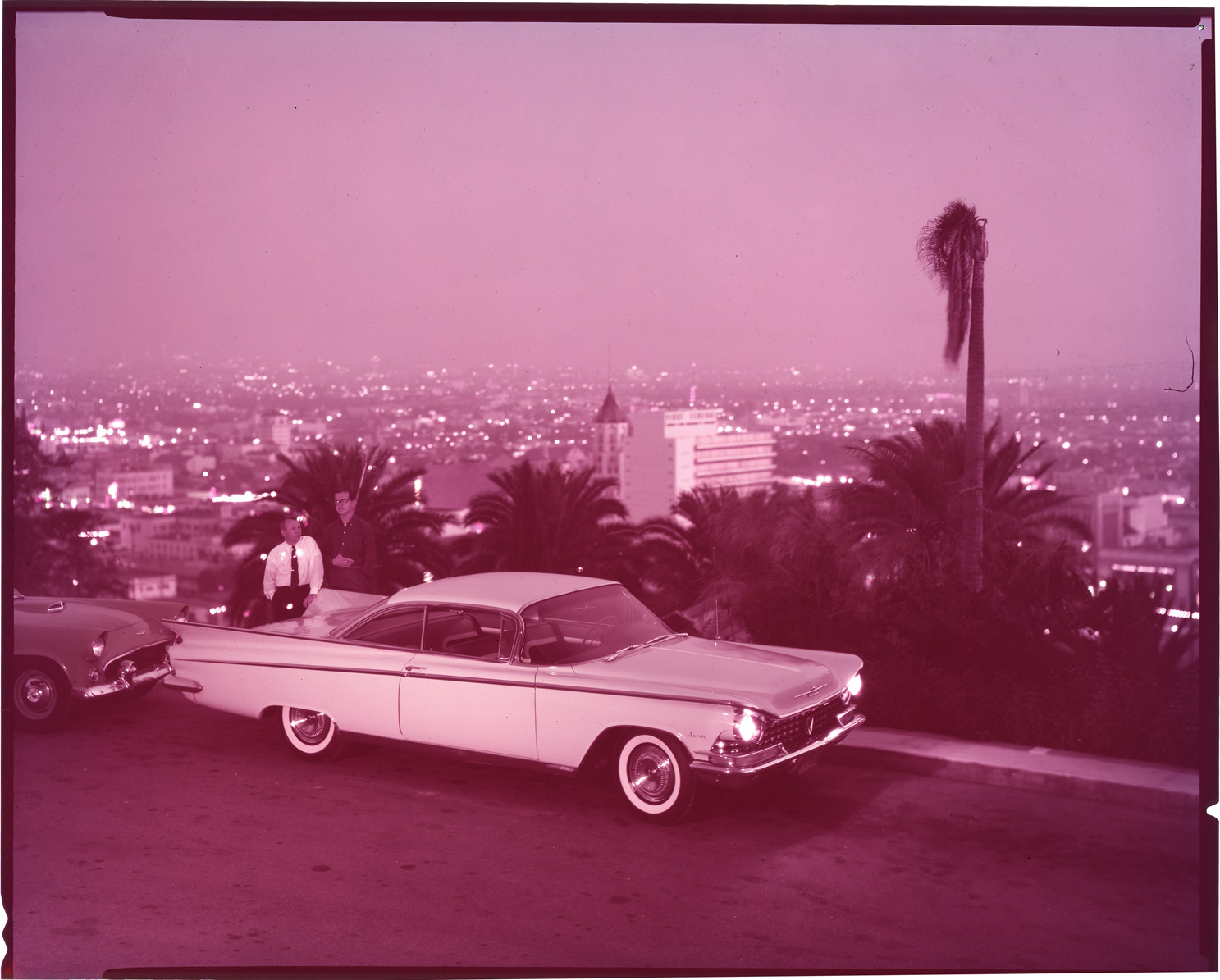 Favorite this☆ 1959 Buick Invicta automobile Description: Nighttime view of two men posing with 1959 Buick Invicta sedan on scenic overlook. Palm trees and city lights in background. Label on sleeve: "General Motors, Buick Invicta, 1959." Details Resource ID: na033002 Creator: Boulevard Photographic (Firm) Subject: Buick automobile Scenic overlooks Advertising--Automobiles Transparencies Date Issued: 1959 Format: 1 transparency : col. ; 8 x 10 in. Member of: National Automotive History Collection Mickey McGuire and Jim Northmore Boulevard Photographic Collection Filing Location: Buick, 1:12 Rights: Physical rights are retained by DPL. Copyright is retained in accordance with U.S. copyright laws.