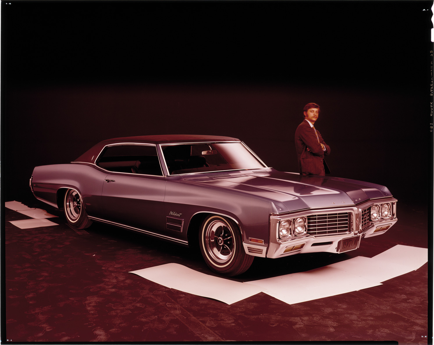 View of man posing with a 1970 Buick Wildcat coupe. Label on sleeve: "General Motors, Buick Wildcat, 1970."
