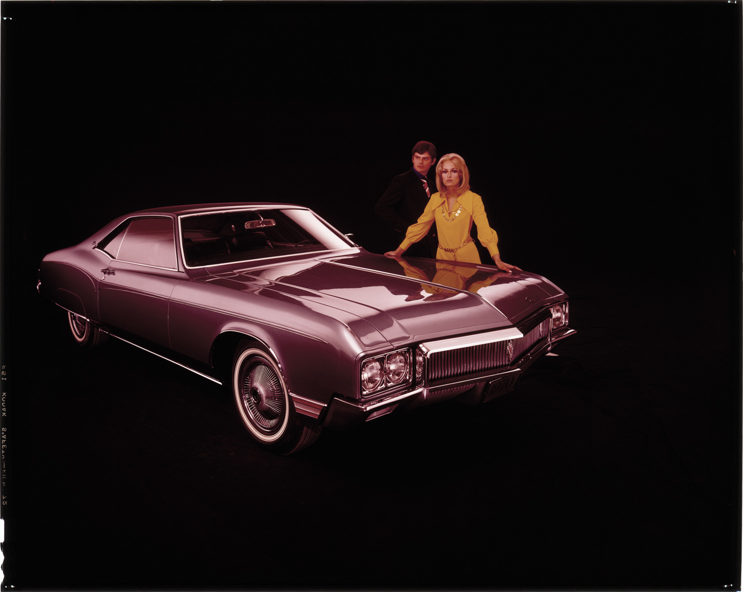 View of man and woman posing with a 1970 Buick Riviera coupe. Label on sleeve: "General Motors, Buick Riviera, 1970."
