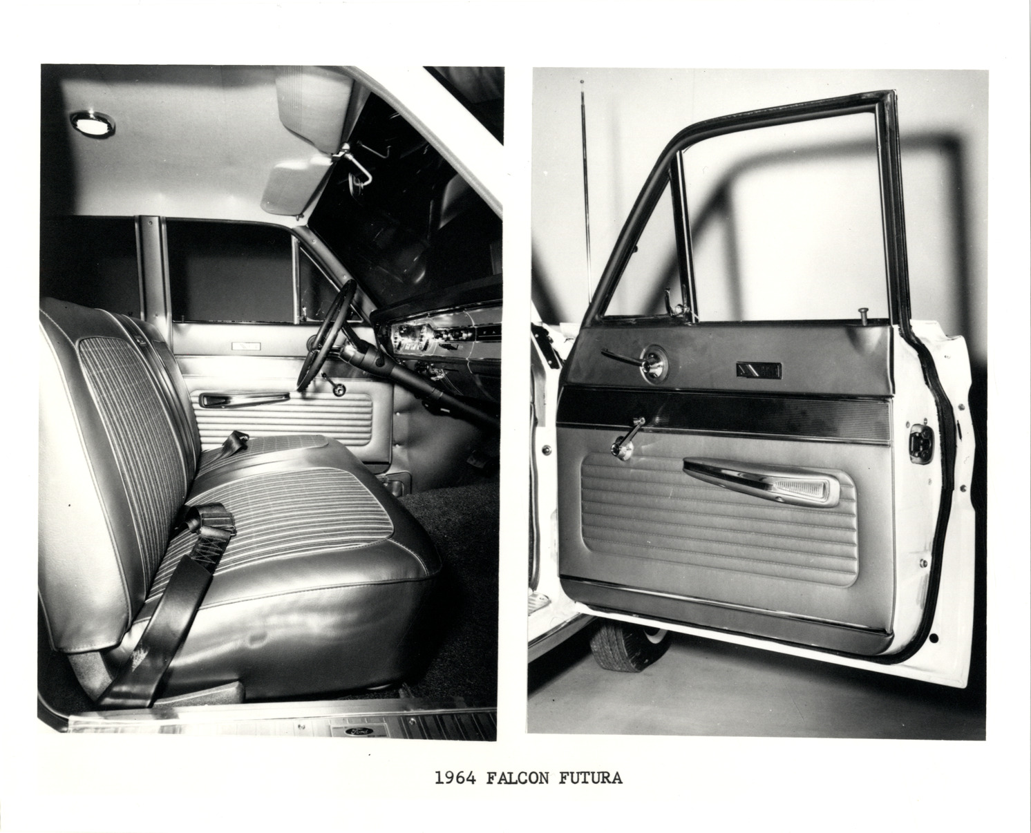 Favorite this☆ 1964 Ford Falcon Futura automobile interior Description: Two views of the interior of a 1964 Ford Falcon Futura car, showing front seats and door. Printed on front: "1964 Falcon Futura." Details Resource ID: na033121 Subject: Ford Falcon automobile Automobiles--Interiors Automobiles--Seats Automobiles--Doors Photographic prints Date Issued: 1964 Format: 1 photographic print ; 8 x 10 in. Member of: National Automotive History Collection Filing Location: Ford, 1964 Rights: Physical rights are retained by DPL. Copyright is retained in accordance with U.S. copyright laws.