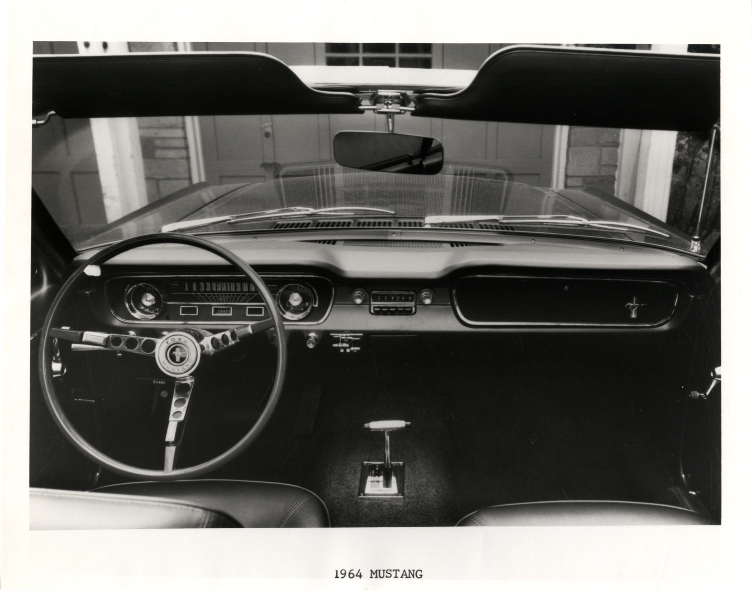 View of the interior of a 1964 Ford Mustang car, showing steering wheel, dashboard and instrument panel. Printed on front: "1964 Mustang."