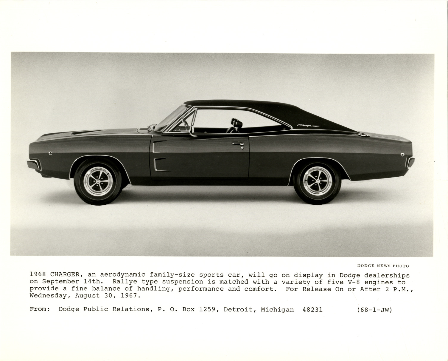 View of a 1968 Dodge Charger coupe. Printed on front: "1968 Charger, an aerodynamic family-size sports car, will go on display in Dodge dealerships on September 14th. Rallye type suspension is matched with a variety of five V-8 engies to provide a fine balance of handling, performance and comfort. For release on or after 2 p.m., Wednesday, August 30, 1967. From: Dodge Public Relations, P.O. Box 1259, Detroit, Michigan 48231. (68-1-JW). Dodge news photo."