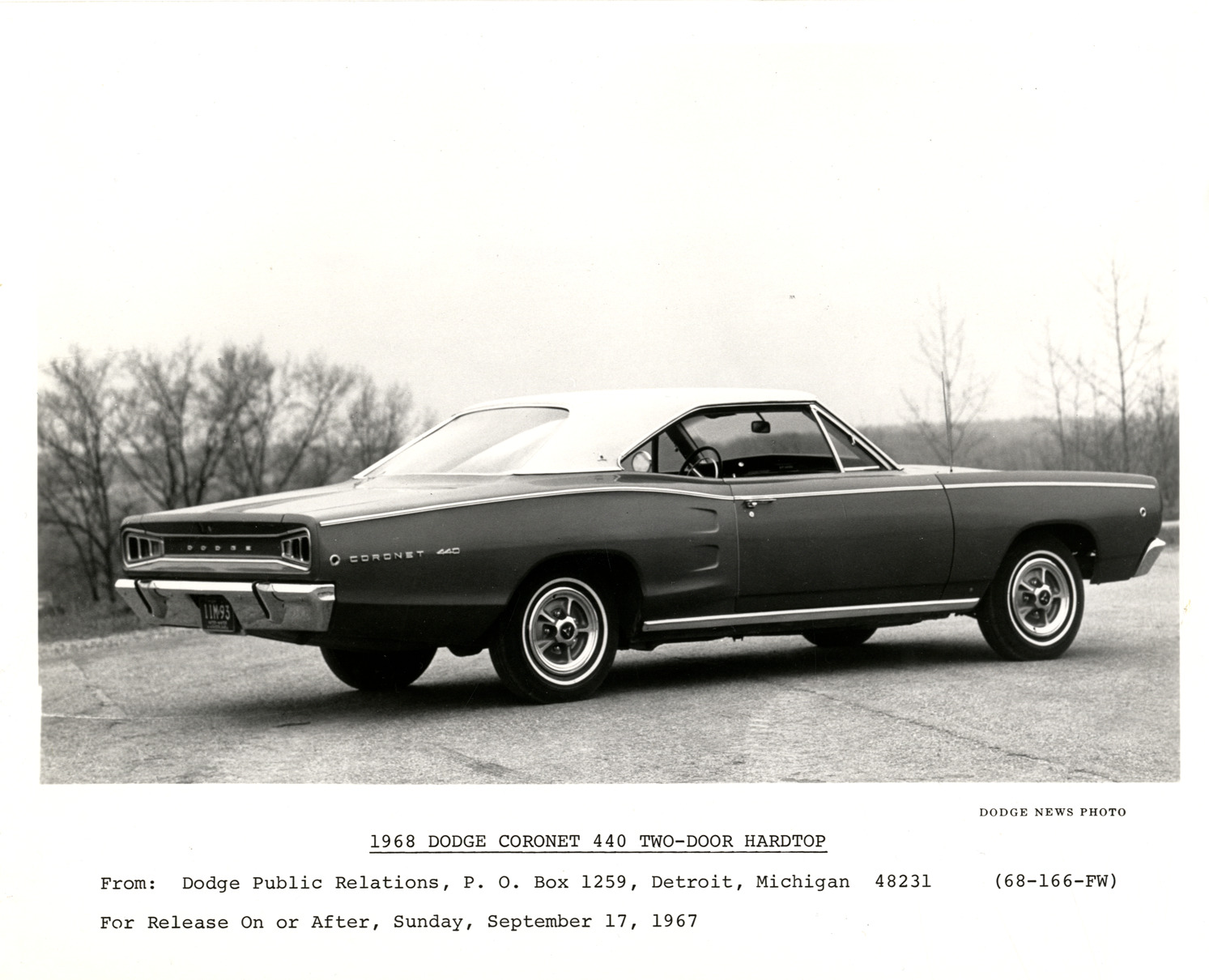 View of a 1968 Dodge Coronet coupe. Printed on front: "1968 Dodge Coronet 440 two-door hardtop. From: Dodge Public Relations, P.O. Box 1259, Detroit, Michigan 48231 For release on or after, Sunday, September 17, 1967. (68-166-FW). Dodge news photo."