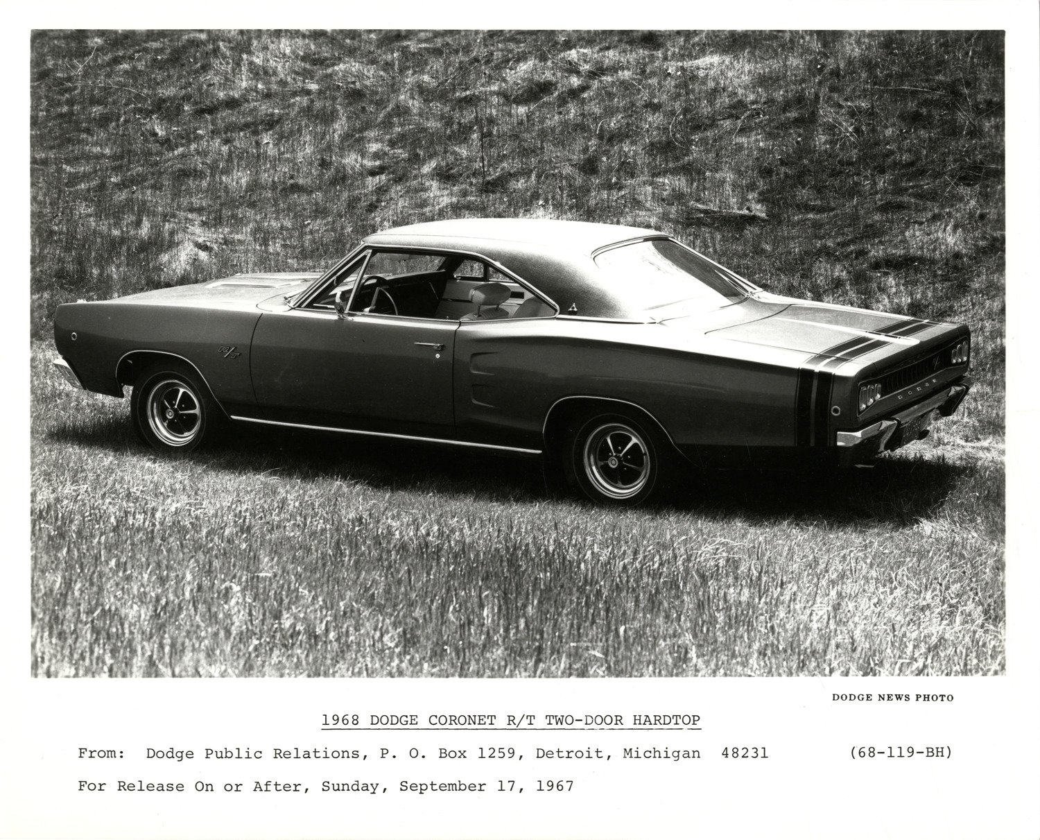 View of a 1968 Dodge Coronet R/T coupe. Printed on front: "1968 Dodge Coronet R/T two-door hardtop. From: Dodge Public Relations, P.O. Box 1259, Detroit, Michigan 48231. For release on or after, Sunday, September 17, 1967. (68-119-BH). Dodge news photo."