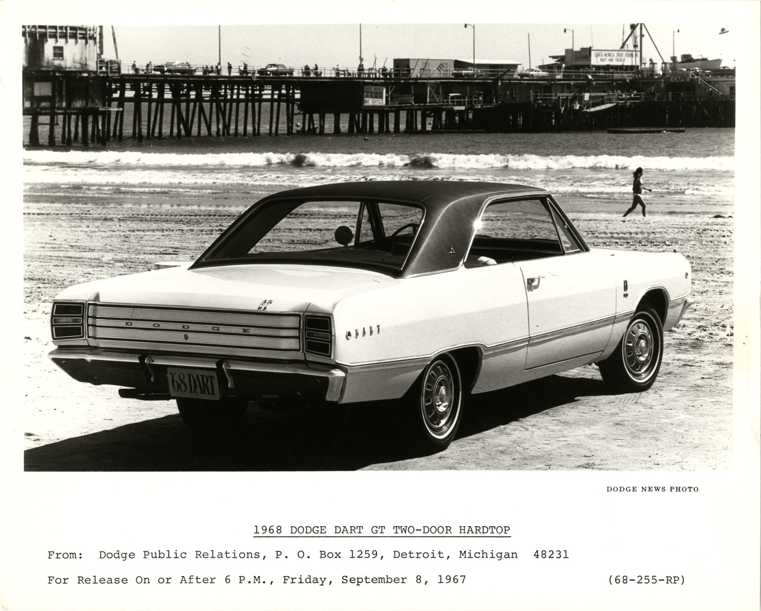 View of a 1968 Dodge Dart GT coupe. Printed on front: "1968 Dodge Dart GT two-door hardtop. From: Dodge Public Relations, P.O. Box 1259, Detroit, Michigan 48231. For release on or after 6 p.m., Friday, September 8, 1967. (68-255-RP). Dodge news photo."