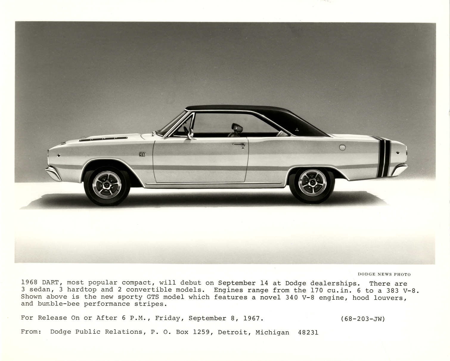 View of a 1968 Dodge Dart GTS coupe. Printed on front: "1968 Dart, most popular compact, will debut on September 14 at Dodge dealerships. There are 3 sedan, 3 hardtop and 2 convertible models. Engines range from the 170 cu. in. 6 to a 383 V-8. Shown above is the new sporty GTS model which features a novel 340 V-8 engine, hood louvers, and bumble-bee performance stripes. For release on or after 6 p.m., Friday, September 8, 1967. From: Dodge Public Relations, P.O. Box 1259, Detroit, Michigan 48231. (68-203-JW). Dodge news photo."
