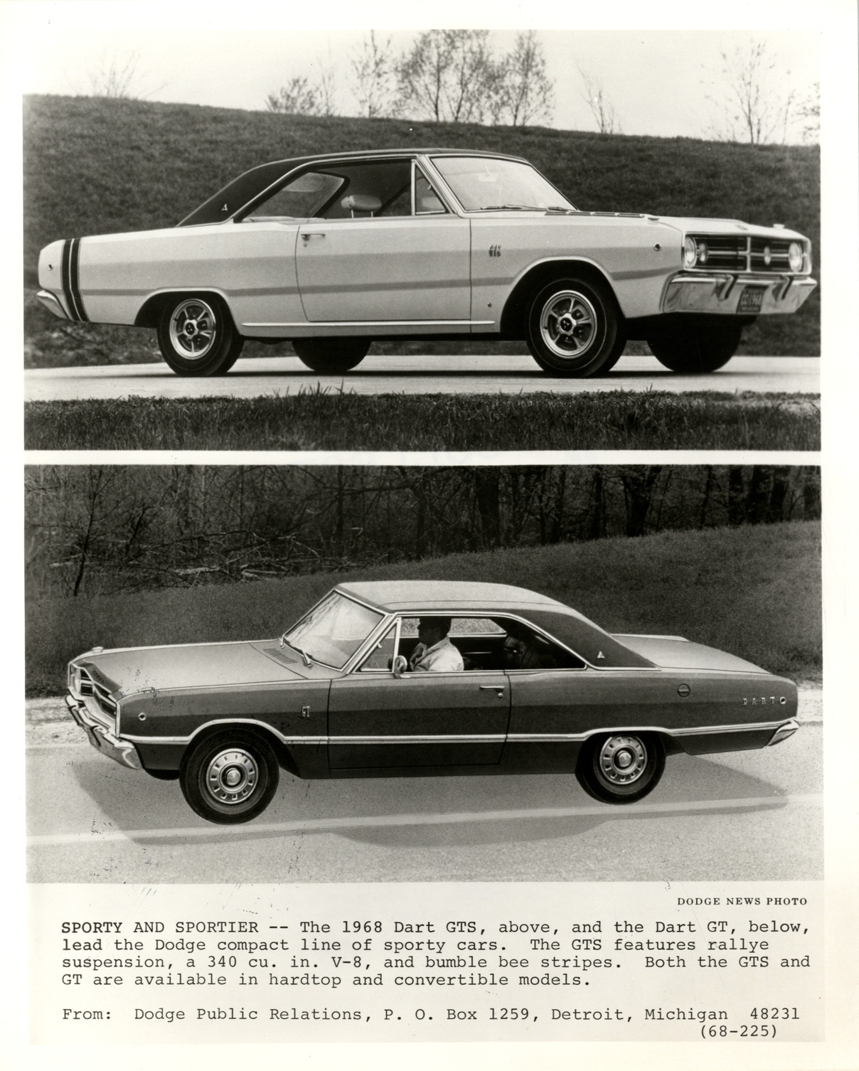 View of 1968 Dodge Dart GTS and Dart GT coupes. Printed on front: "Sporty and sportier. The 1968 Dart GTS, above, and the Dart GT, below, lead the Dodge compact line of sporty cars. The GTS features rallye suspension, a 340 cu. in. V-8, and bumble bee stripes. Both the GTS and GT are available in hardtop and convertible models. From: Dodge Public Relations, P.O. Box 1259, Detroit, Michigan 48231. (68-225). Dodge news photo."