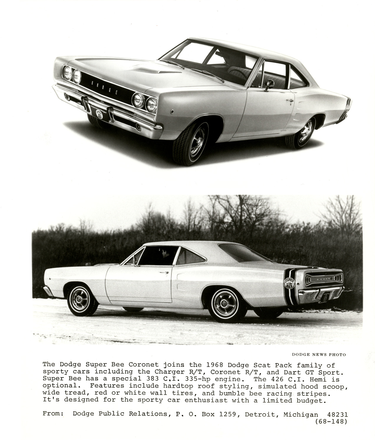 Two views of a 1968 Dodge Super Bee Coronet coupe. Printed on front: "The Dodge Super Bee Coronet joins the 1968 Dodge Scat Pack family of sporty cars including the Charger R/T, and Dart GT Sport. Super Bee has a special 383 C.I. 335-hp engine. The 426 C.I. Hemi is optional. Features include hardtop roof styling, simulated hood scoop, wide tread, red or white wall tires, and bumble bee racing stripes. It's designed for the sporty car enthusiast with a limited budget. From: Dodge Public Relations, P.O. Box 1259, Detroit, Michigan 48231 (68-148). Dodge news photo."