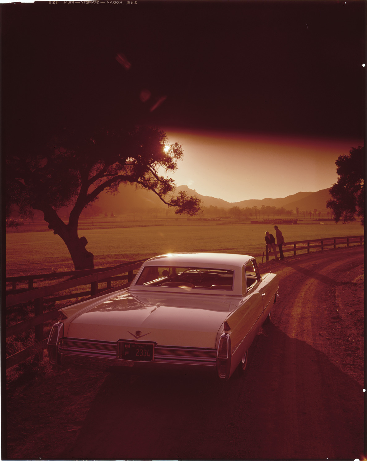 Rear view of a 1963 Cadillac coupe. Two men stand next to fence in background. Label on sleeve: "General Motors, Cadillac, 1963."