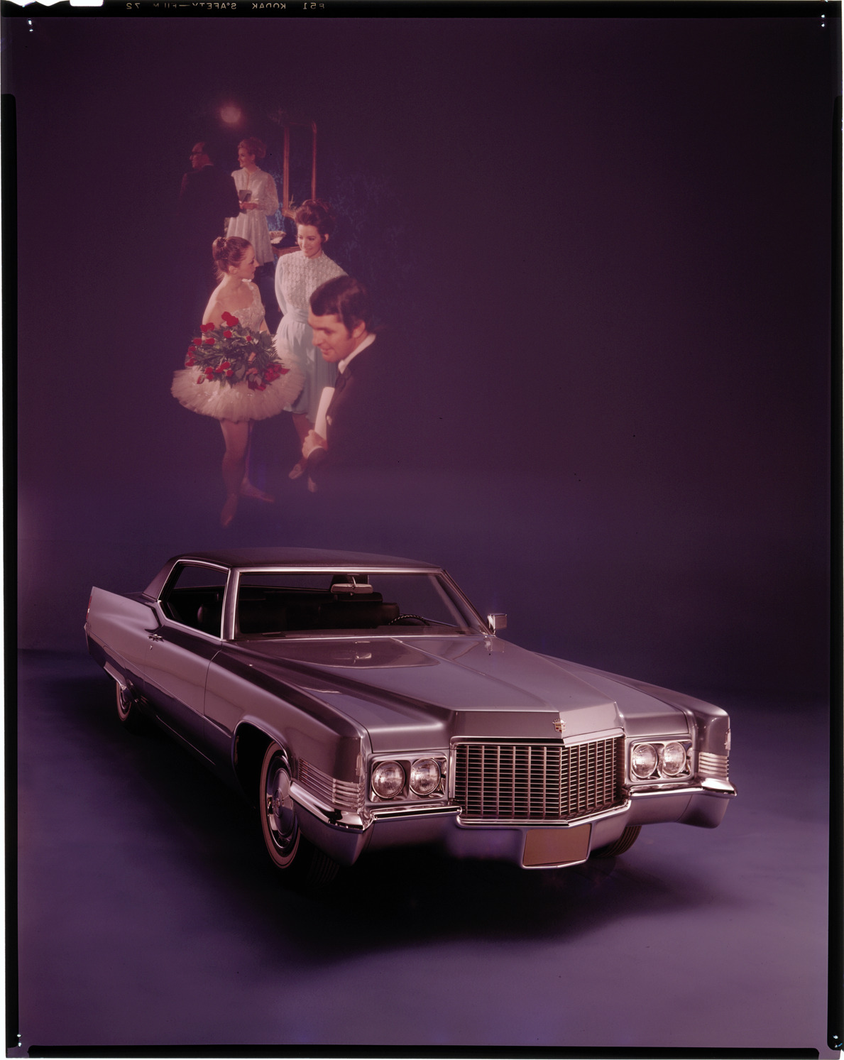 View of a 1970 Cadillac coupe. Image of a ballerina, holding a bouquet of flowers, and a group of theatergoers is superimposed over automobile. Label on sleeve: "General Motors, Cadillac, 1970."