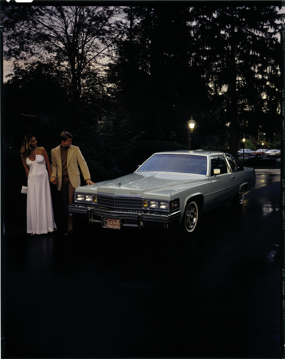View of man and woman posing with a 1977 Cadillac sedan. Label on sleeve: "General Motors, Cadillac, 1977."