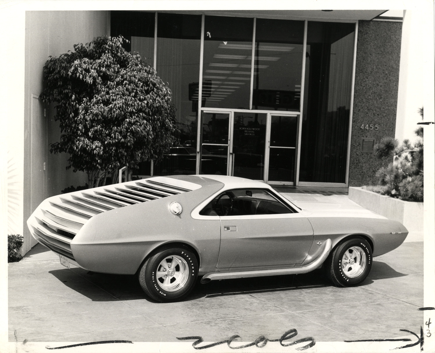 Favorite this☆ 1968 AMC AMX automobile Description: View of a 1968 AMC AMX coupe. North Hollywood Federal Savings building in background. Stamped on back: "Barris Kustom Industries, 10811 Riverside Dr., North Hollywood, California 91602. 877-2352, 984-1314." Handwritten on back: "AMX-ized sportster." Details Resource ID: na033367 Subject: AMX automobile Photographic prints Date Issued: 1968 Format: 1 photographic print ; 8 x 10 in. Member of: National Automotive History Collection Filing Location: AMC, 1968 Rights: Physical rights are retained by DPL. Copyright is retained in accordance with U.S. copyright laws.