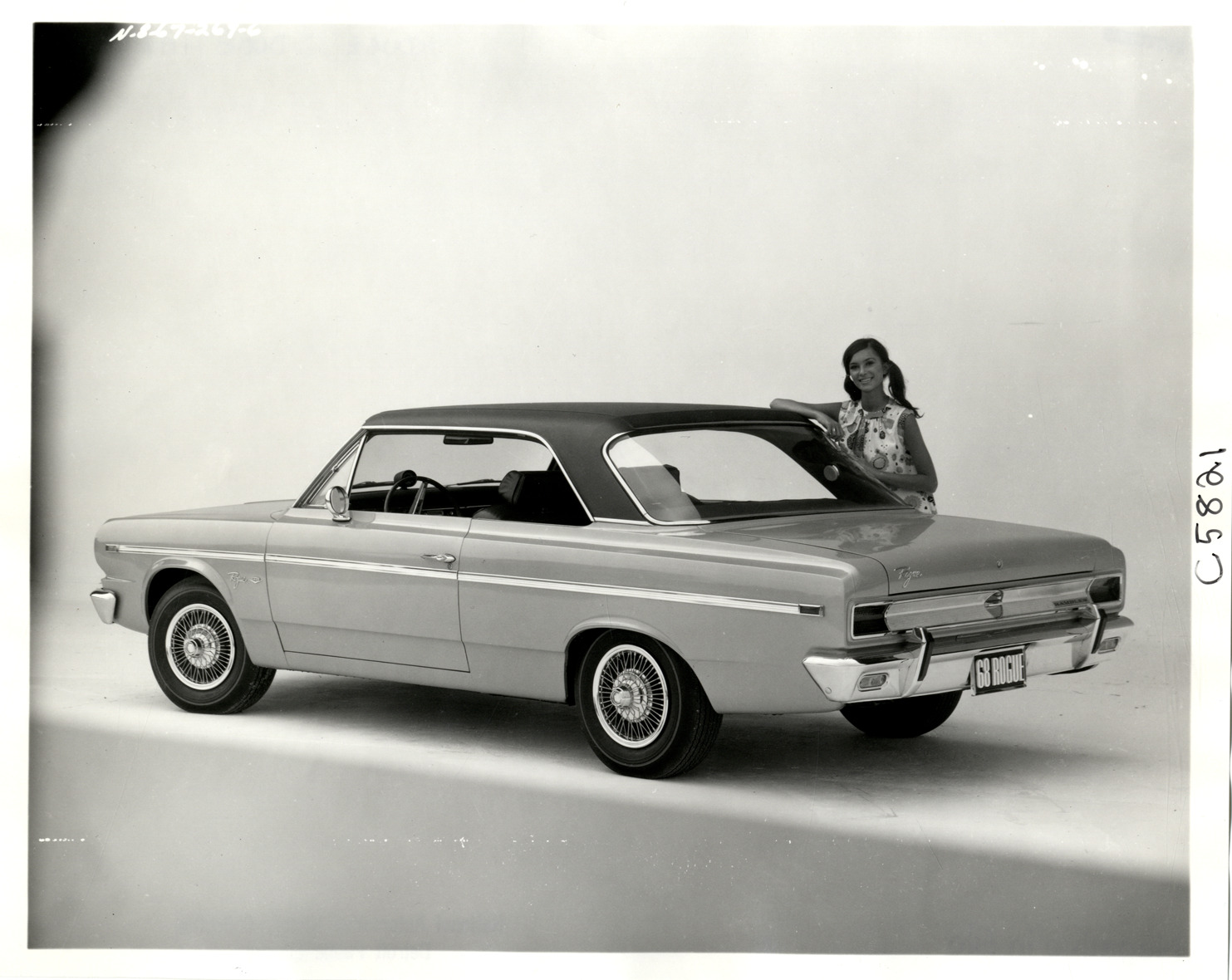 View of woman posing with a 1968 AMC Rambler Rogue coupe. Handwritten on back: "Rogue 2 door hardtop."