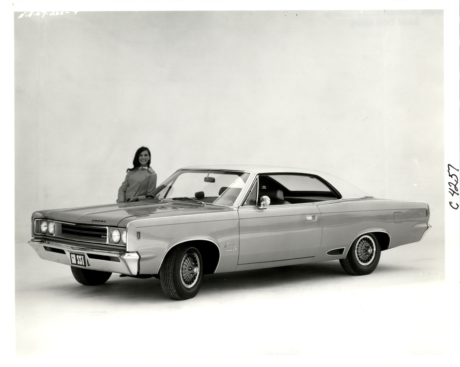 View of woman posing with a 1968 AMC Rebel SST coupe. Handwritten on back: "Rebel SST 2 door hardtop."