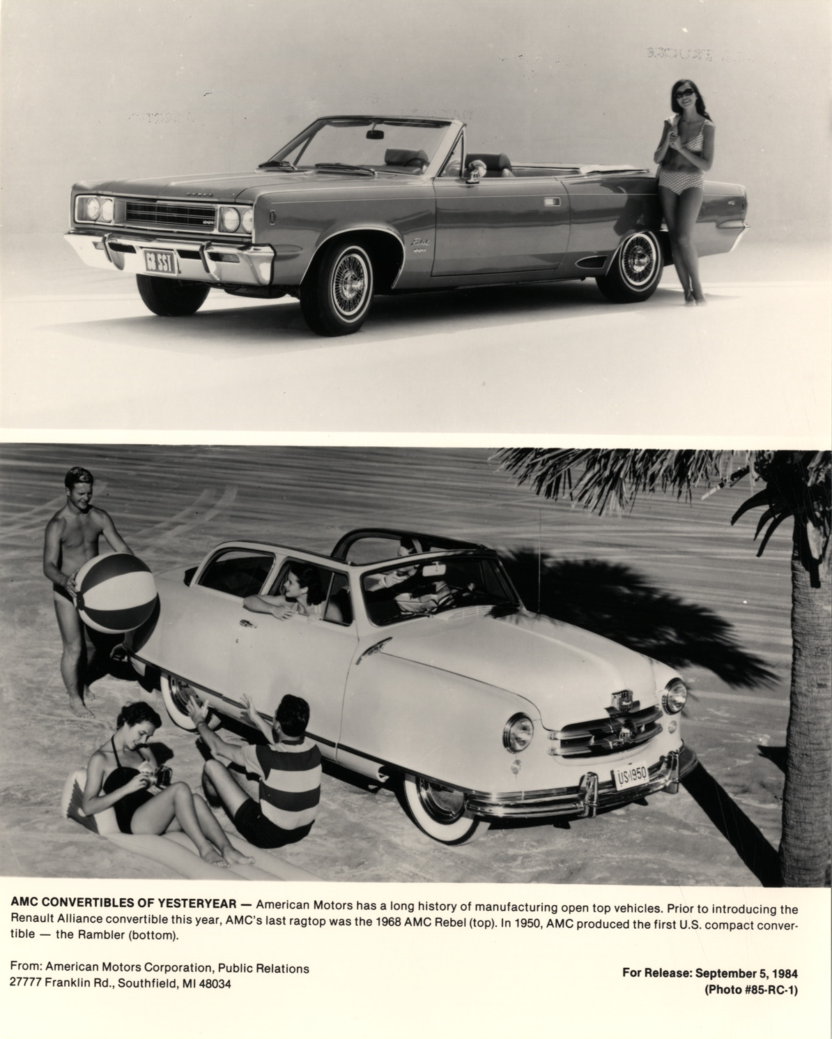Separate views of a woman posing with a 1968 AMC Rambler Rebel convertible and several beachgoers posing with a 1950 AMC Rambler convertible. Printed on front: "AMC convertibles of yesteryear. American Motors has a long history of manufacturing open top vehicles. Prior to introducing the Renault Alliance convertible this year, AMC's last ragtop was the 1968 AMC Rebel (top). In 1950, AMC produced the first U.S. compact convertible -- the Rambler (bottom). From: American Motors Corporation, Public Relations, 27777 Franklin Rd., Southfield, MI 48034. For release: September 5, 1984. (Photo #85-RC-1)."