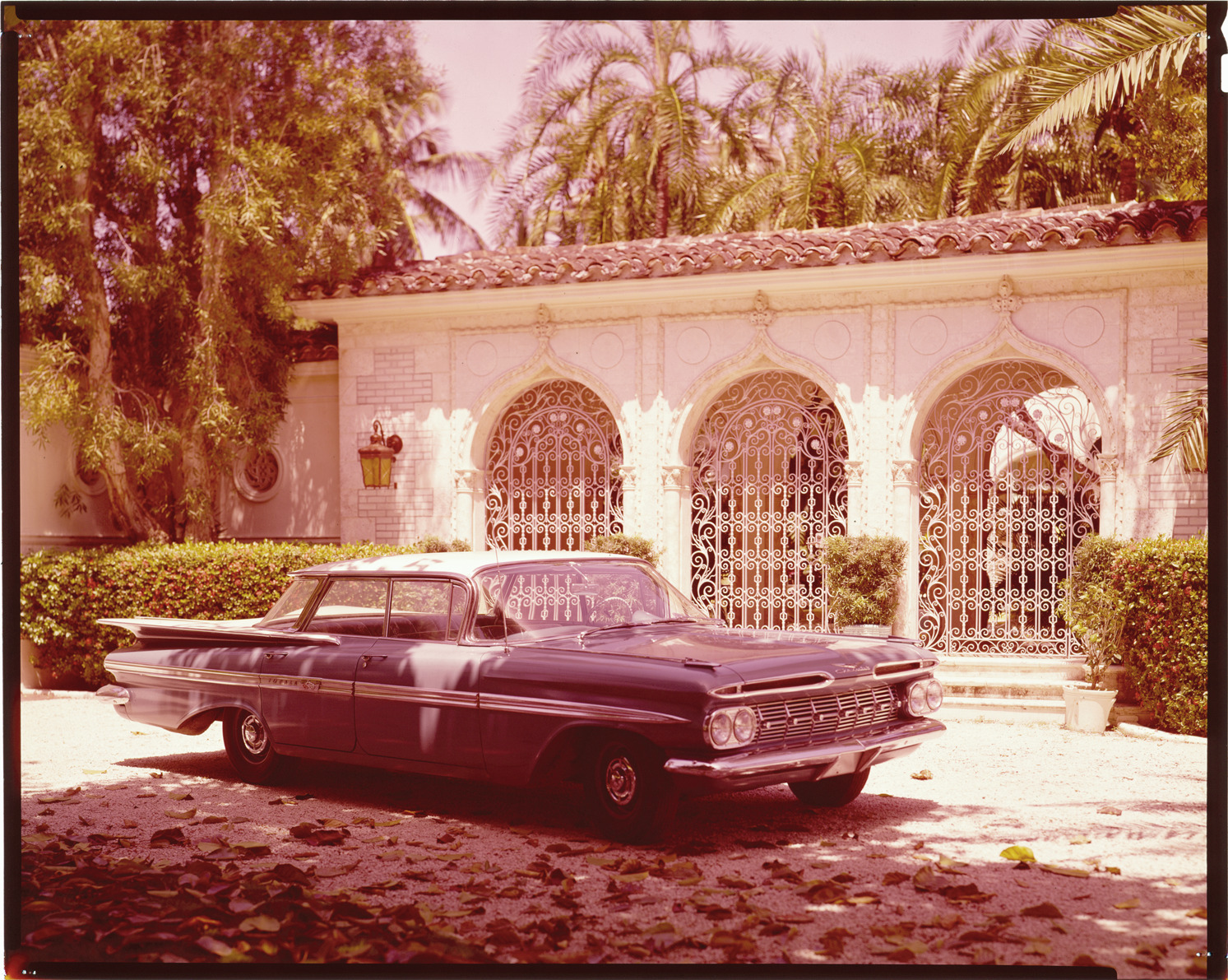 View of a 1959 Chevrolet Impala sedan. Building with decorative wrought-iron gates in background. Label on sleeve: "General Motors, Chevrolet Impala, 1959."