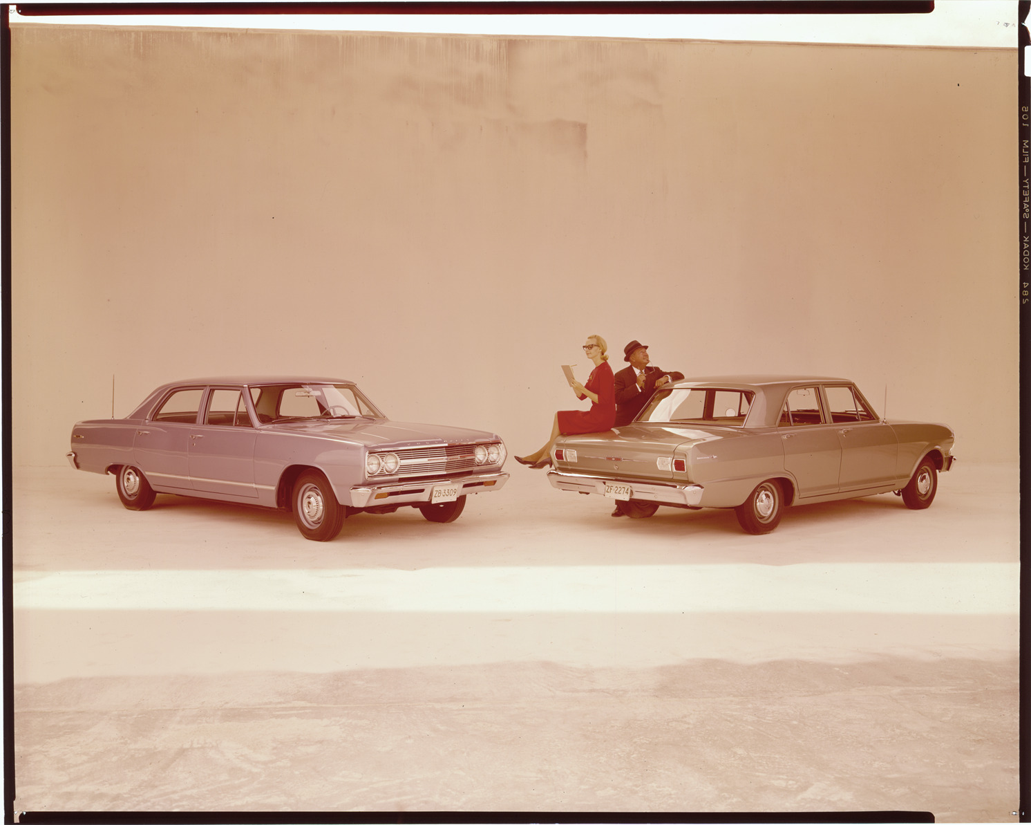 View of a man and woman posing with two 1965 Chevrolet Chevy II sedans. Label on sleeve: "General Motors, Chevrolet product line, 1965."