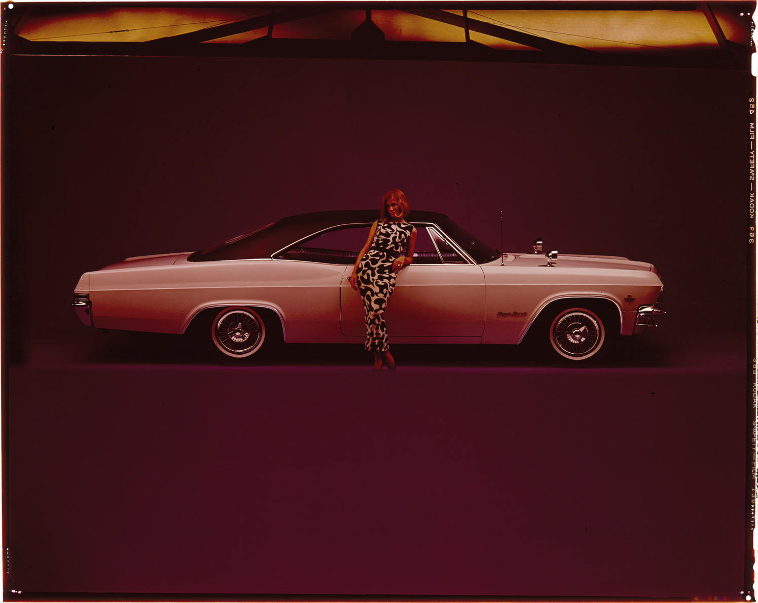 View of a woman posing with a 1965 Chevrolet Super Sport coupe. Label on sleeve: "General Motors, Chevrolet Super Sport, 1965."
