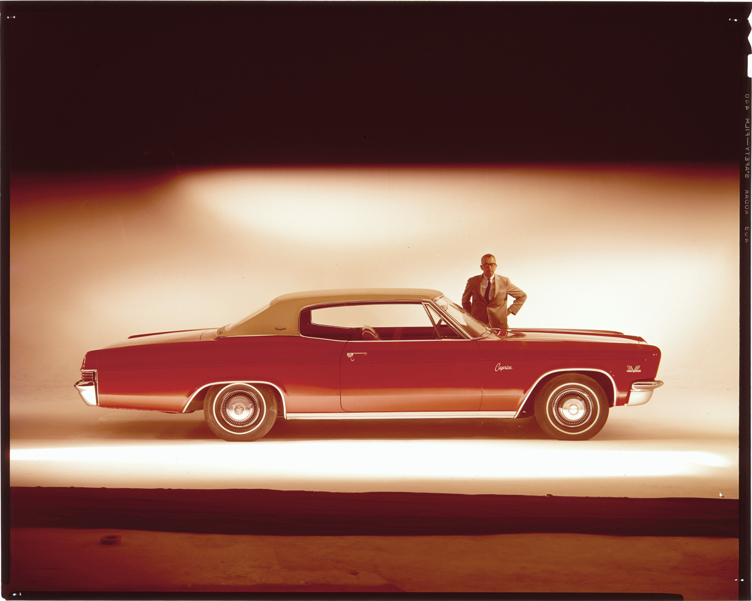 View of a man posing with a 1966 Chevrolet Caprice coupe. Label on sleeve: "General Motors, Chevrolet Caprice, 1966."