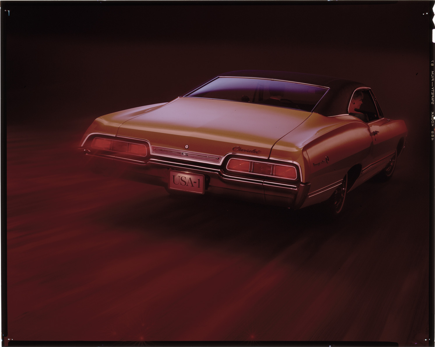 Rear view of a 1967 Chevrolet Impala coupe. Label on sleeve: "General Motors, Chevrolet Impala, 1967."
