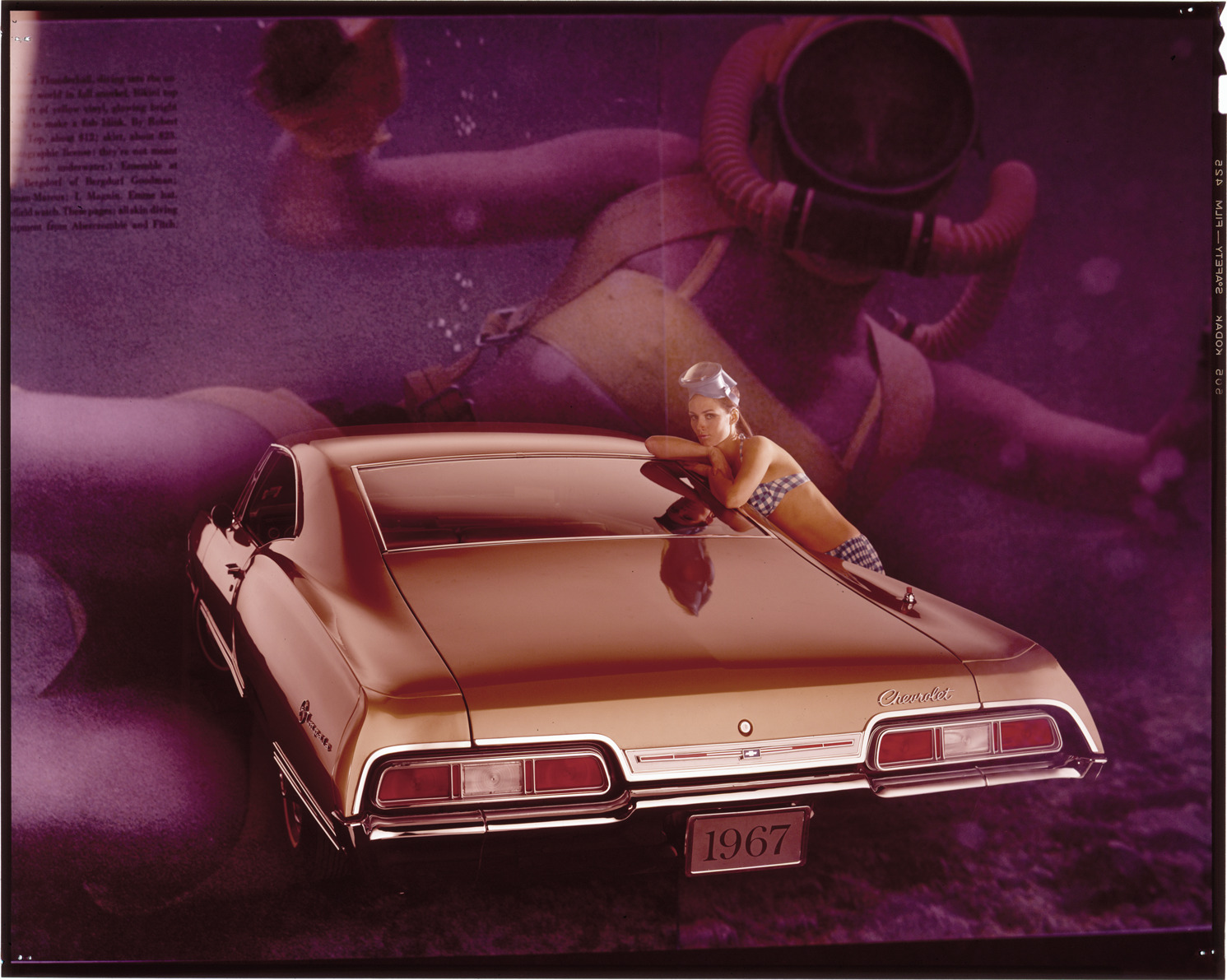 Rear view of a 1967 Chevrolet Impala coupe. Woman wearing bathing suit and swim mask leans against car. Label on sleeve: "General Motors, Chevrolet Impala, 1967."