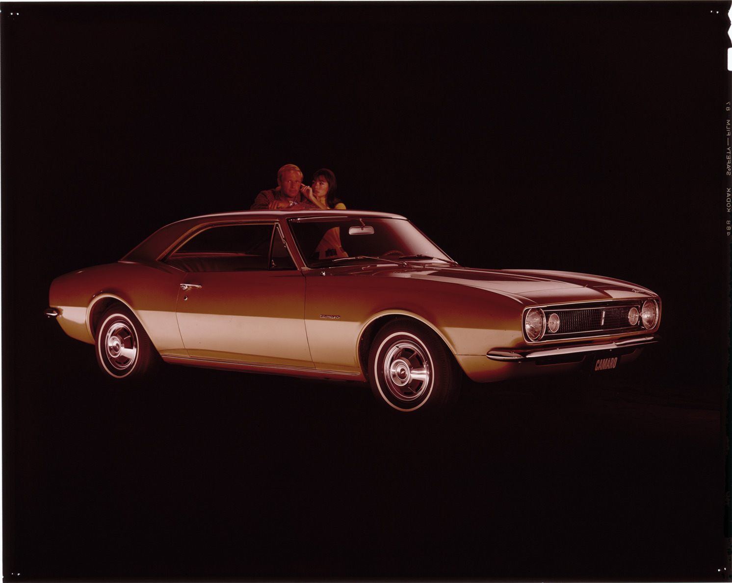 View of a man and woman posing with a 1967 Chevrolet Camaro coupe. Label on sleeve: "General Motors, Chevrolet Camaro, 1967."