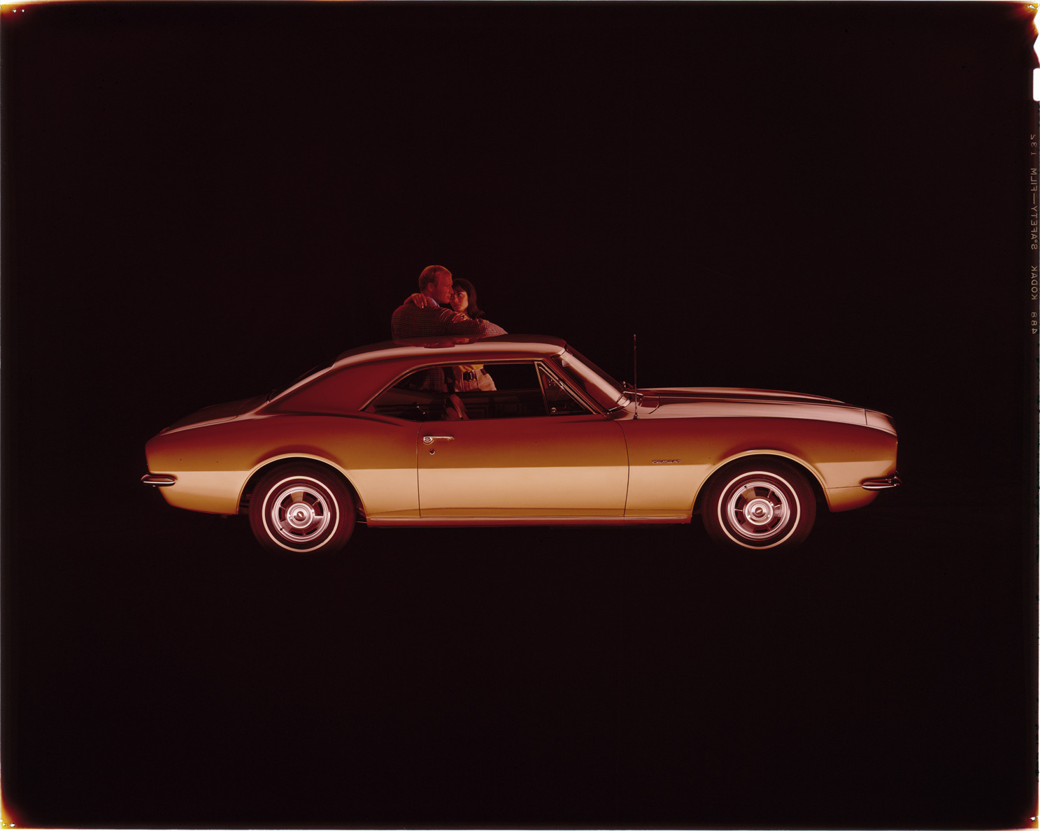 View of a man and woman posing with a 1967 Chevrolet Camaro coupe. Label on sleeve: "General Motors, Chevrolet Camaro, 1967."
