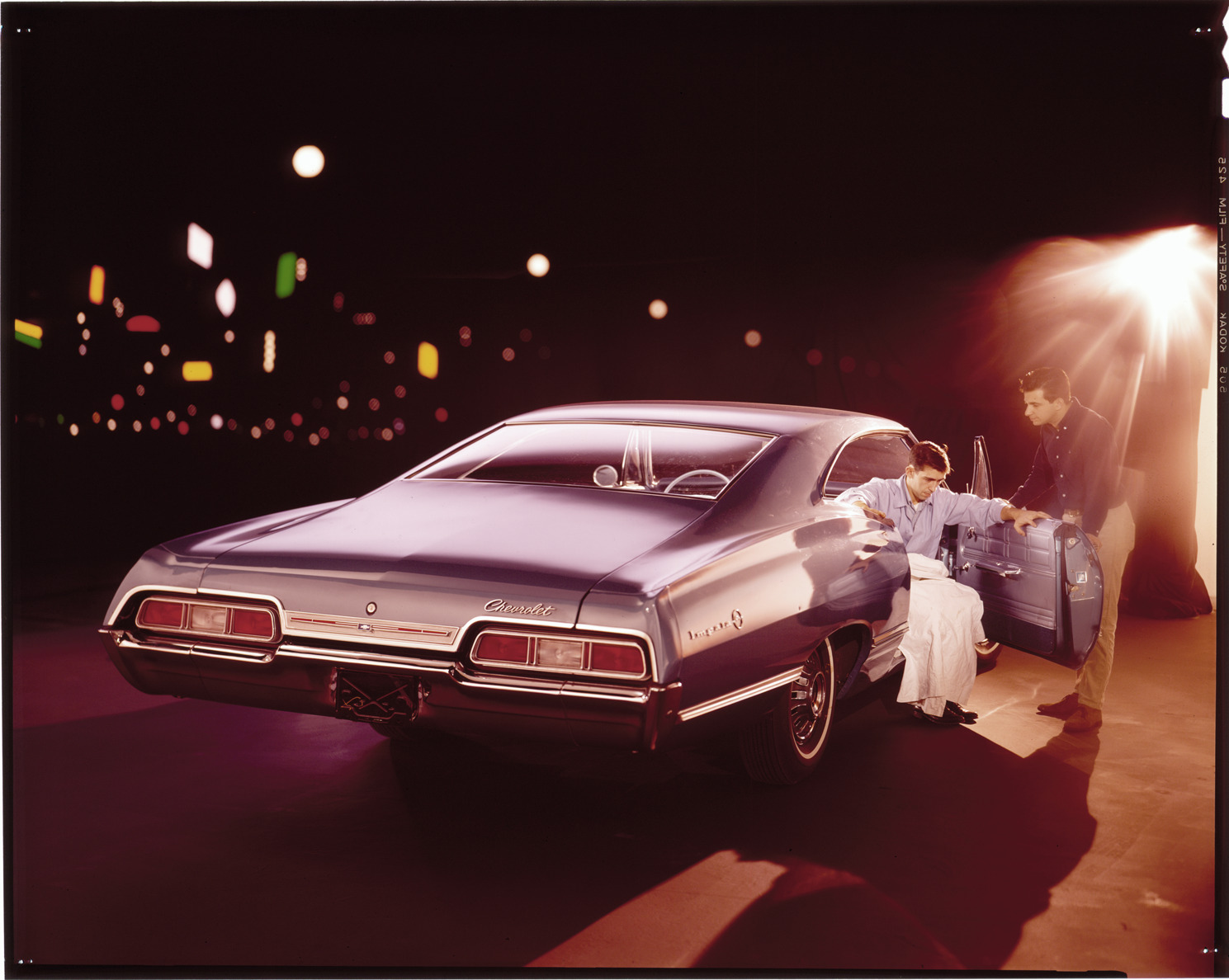 View of two men posing with a 1967 Chevrolet Impala coupe. Label on sleeve: "General Motors, Chevrolet Impala, 1967."