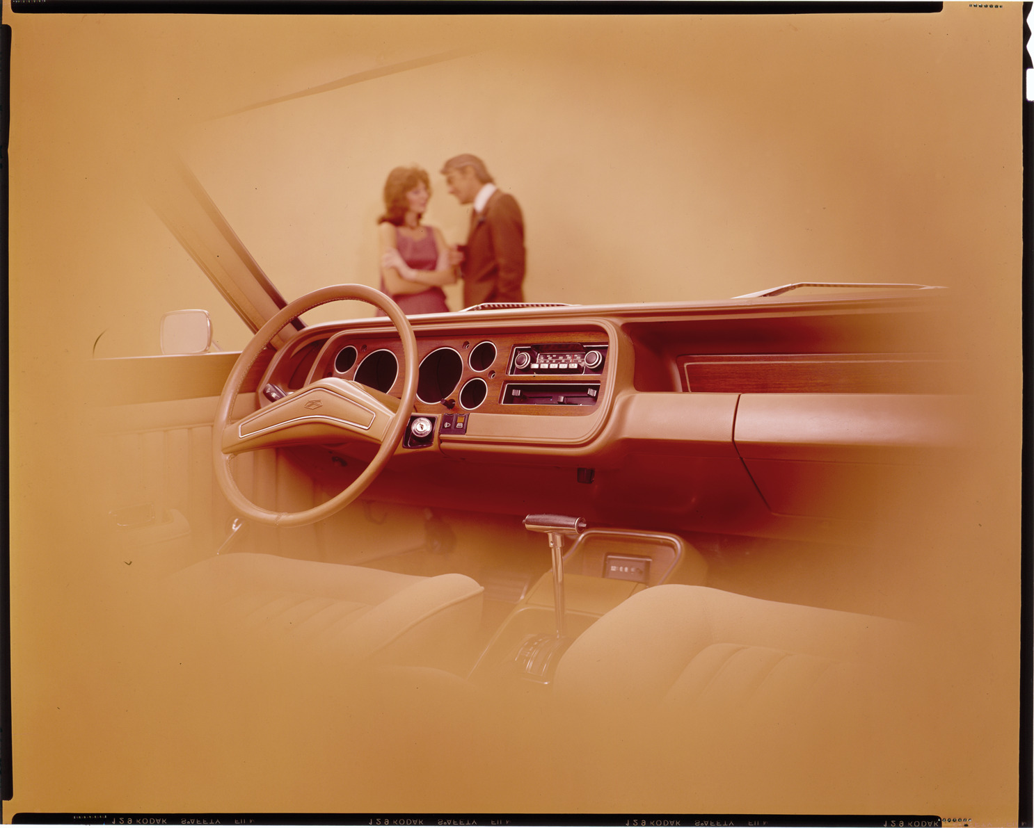 Close-up view of steering wheel and instrument panel on an unidentified Chevrolet car. Man and woman pose in background. Label on sleeve: "General Motors, Chevrolet interior, date unknown, 1960s."