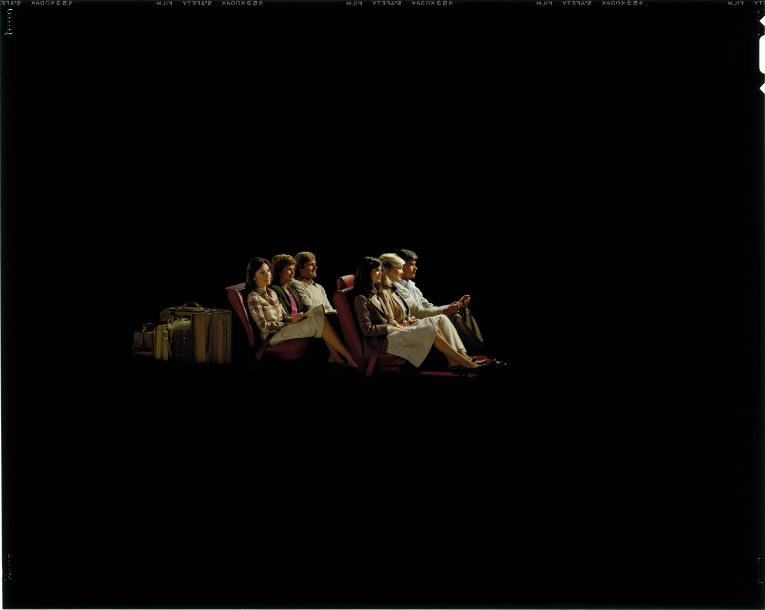 Cutaway view of models posing on seats of an unidentified Chevrolet car. Suitcases are arranged behind rear seat. Label on sleeve: "General Motors, Chevrolet interior with people, date unknown."