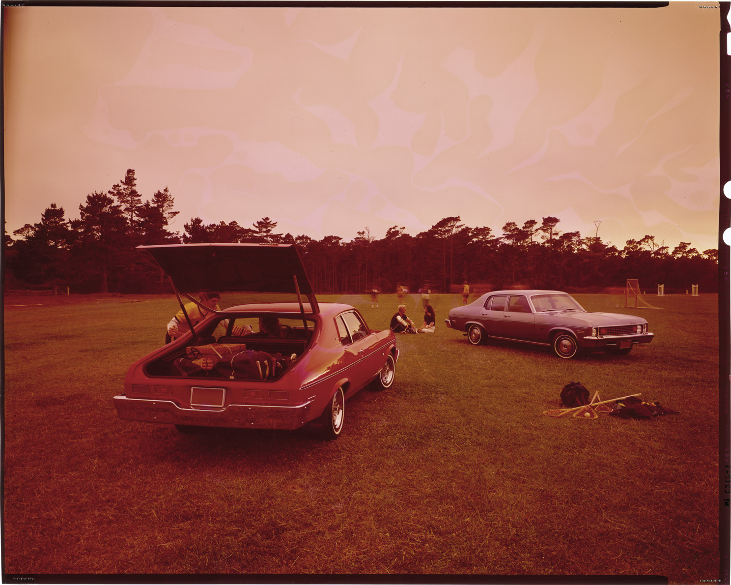 View of a 1974 Chevrolet Nova coupe and a 1974 Chevrolet Nova sedan on a lacrosse field. Label on sleeve: "General Motors, Chevrolet Nova, 1974."