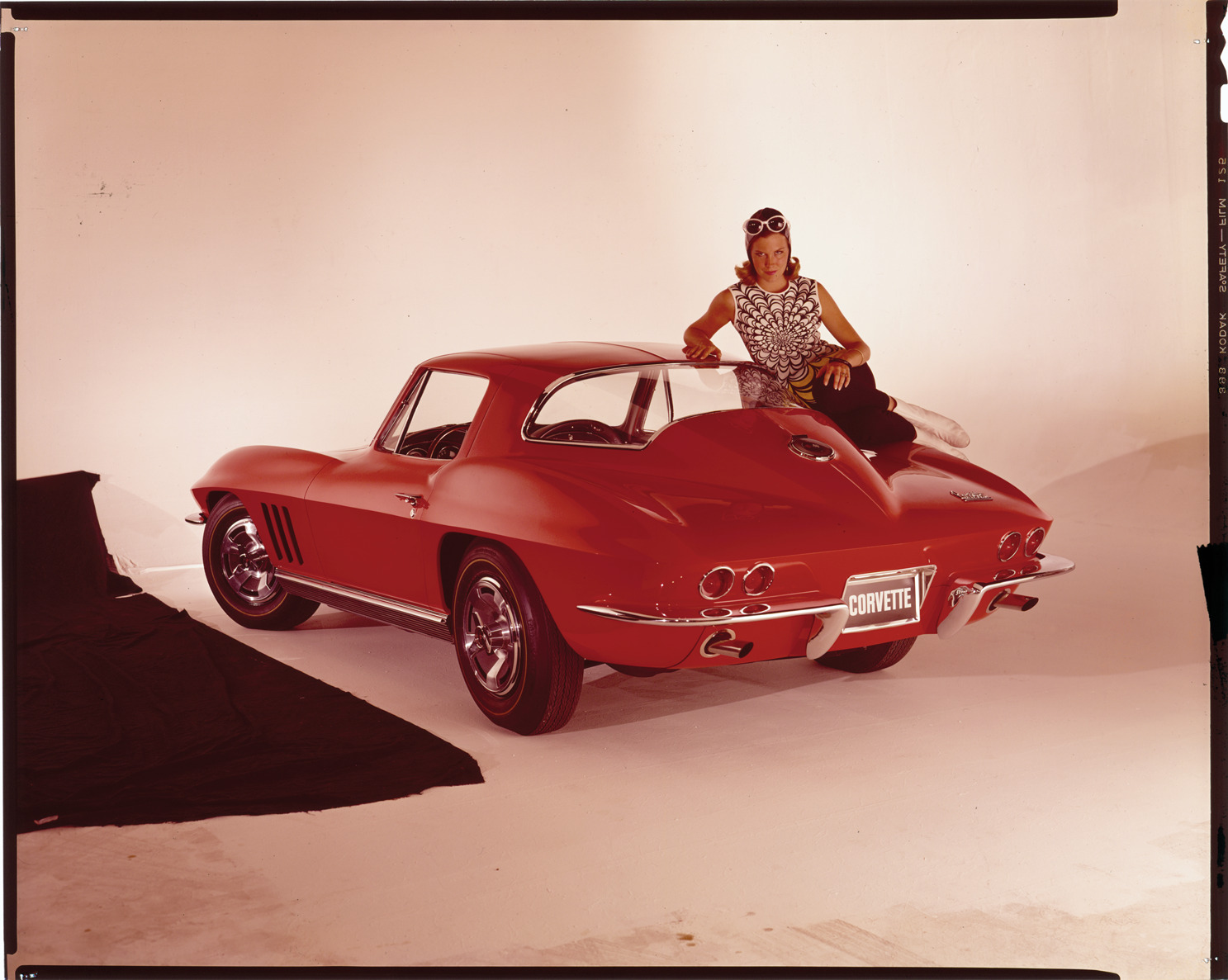 View of a woman posing with a Chevrolet Corvette coupe. Label on sleeve: "General Motors, Chevrolet Corvette, 1966-67."