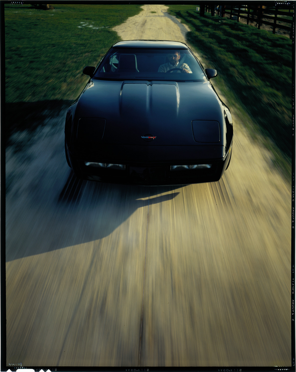Front view of a man driving a Chevrolet Corvette coupe. Label on sleeve: "General Motors, Chevrolet Corvette, 1984-85."