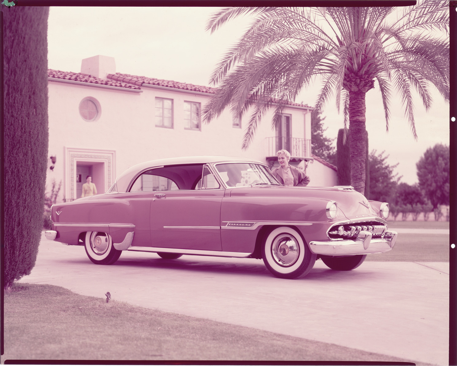 Favorite this☆ 1954 Chrysler DeSoto automobile Description: View of a man and woman posing with a 1954 Chrysler DeSoto Firedome coupe. House and palm tree in background. Label on sleeve: "Chrysler Corporation, DeSoto, 1954." Details Resource ID: na033814 Creator: Boulevard Photographic (Firm) Subject: DeSoto automobile Advertising--Automobiles Transparencies Date Issued: 1954 Format: 1 transparency : col. ; 8 x 10 in. Member of: National Automotive History Collection Mickey McGuire and Jim Northmore Boulevard Photographic Collection Filing Location: DeSoto, 3:17 Rights: Physical rights are retained by DPL. Copyright is retained in accordance with U.S. copyright laws.