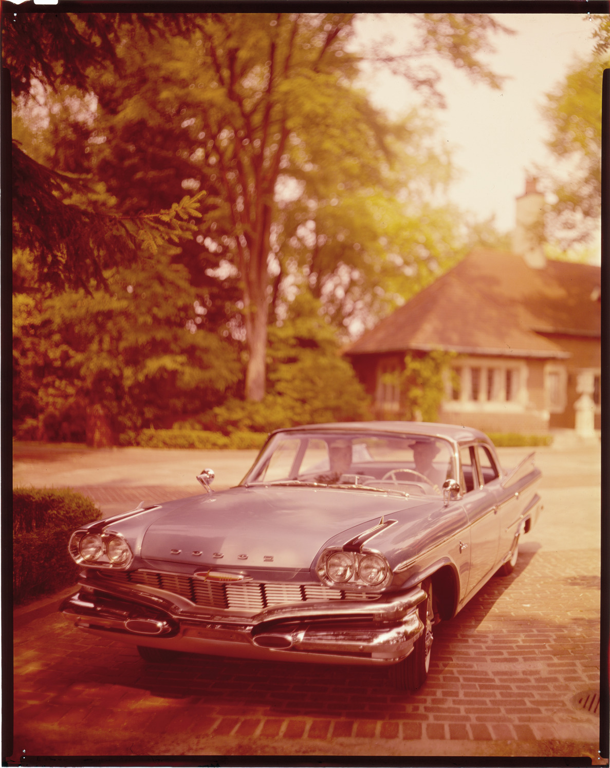 View of a man and woman posing in a 1960 Dodge Polara sedan. House in background. Label on sleeve: "Chrysler Corporation, Dodge Polara, 1960."