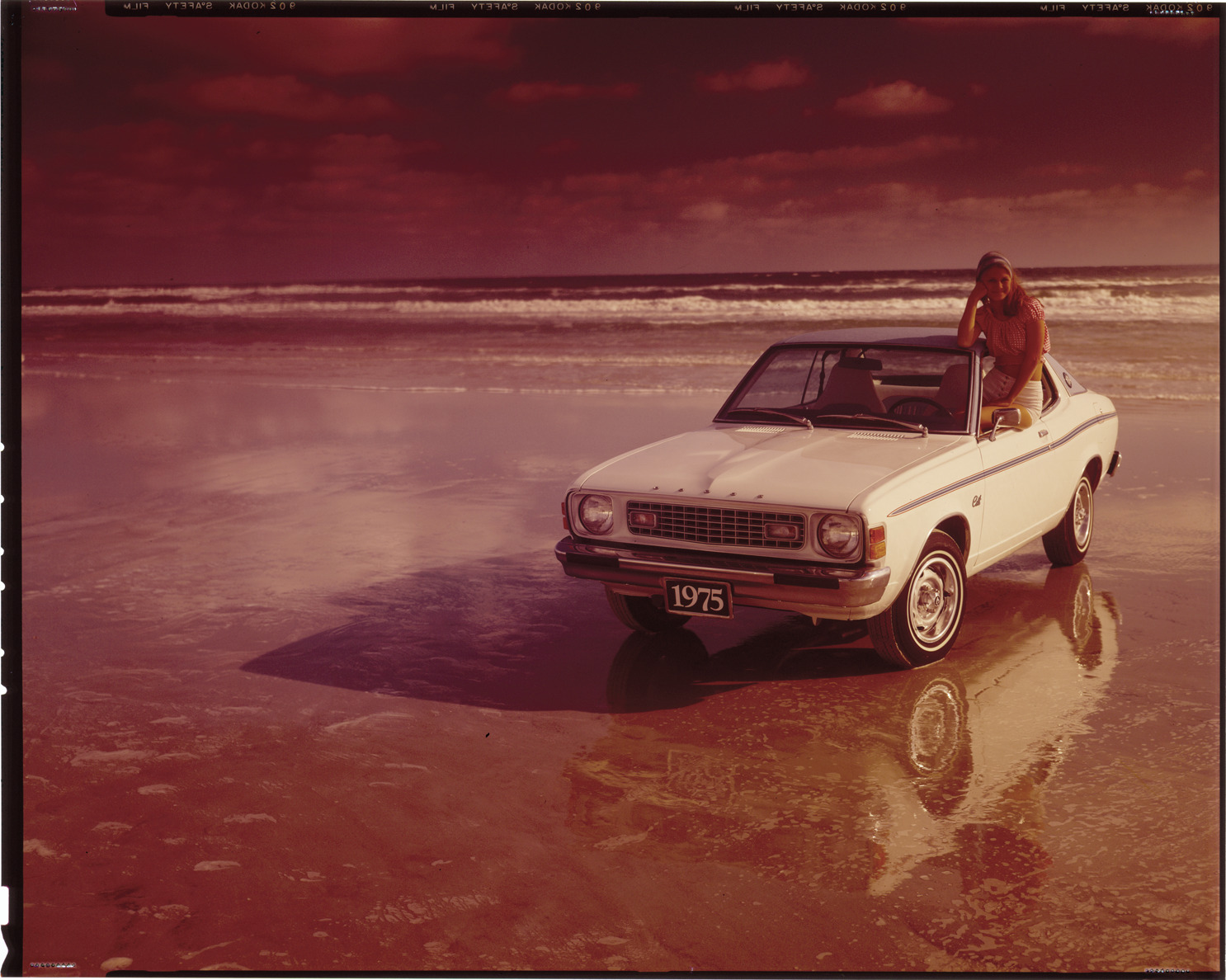 View of a woman posing with a 1975 Dodge Colt coupe on the beach. Label on sleeve: "Chrysler Corporation, Dodge Colt (import), 1975."