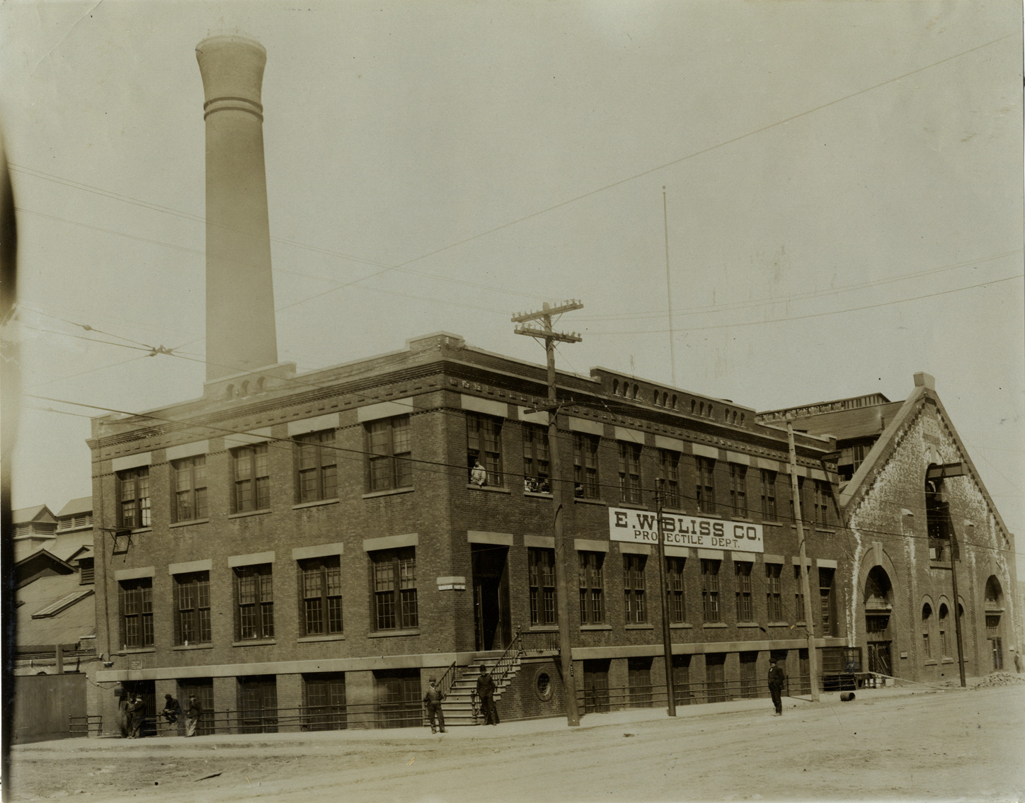 View of men posing in front of the E.W. Bliss Company, Projectile Department factory in Brooklyn, New York. "E.W. Bliss Co., Projectile Dept." sign is displayed in front of brick factory building. Handwritten on back: "Factories--Bliss, E.W. Brooklyn, N.Y., 1906."