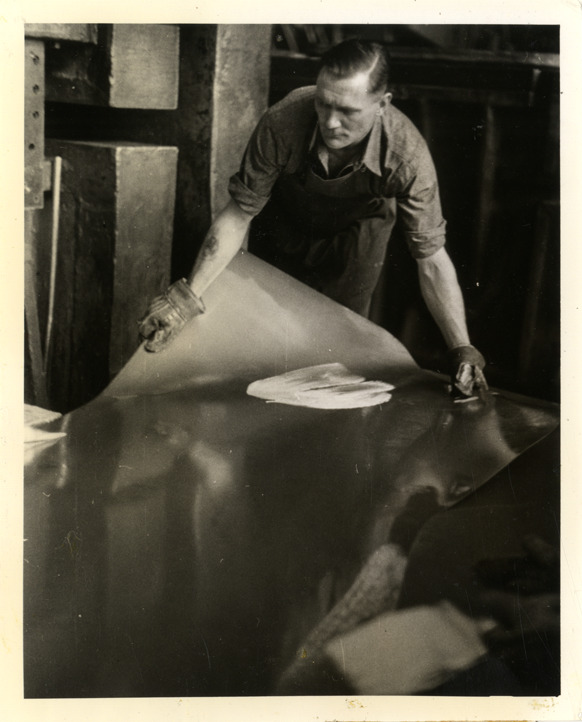 View of a man handling sheet metal at the Buick Motor Company factory. Label on front: "Buick, 1937. Lubricant spot helps draw sheet without strain or wrinkle." Handwritten on back: "Lubricant spot helps draw sheet without strain or wrinkle. Factories--Buick."