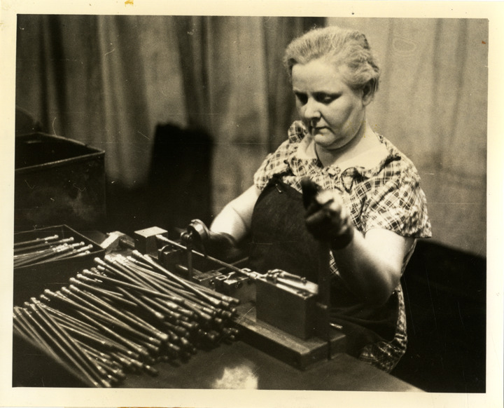 Woman worker checking valve pushrods, Buick Motor Company factory