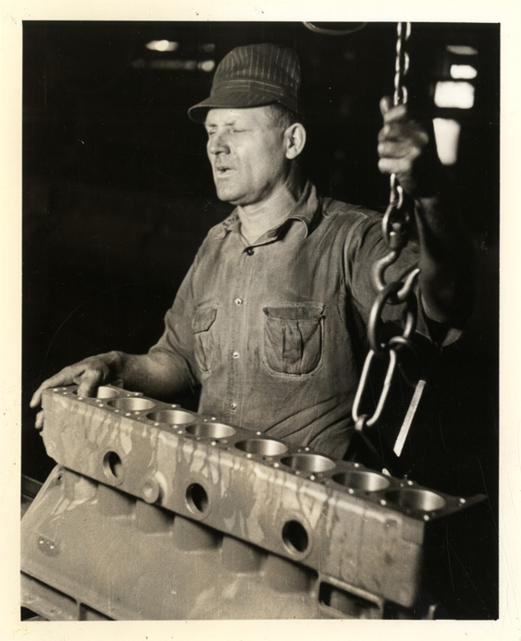 Favorite this☆ Worker with engine block, Buick Motor Company factory Description: View of a man with engine block suspended on chain at the Buick Motor Company factory. Handwritten on back: "Factories--Buick." Details Resource ID: na034042 Subject: Automobile industry workers Automobiles--Motors--Cylinder blocks Automobile factories Buick Motor Company Photographic prints Date Issued: 1937 Format: 1 photographic print ; 5 x 4 in. Member of: National Automotive History Collection Filing Location: Factories--Buick Rights: Physical rights are retained by DPL. Copyright is retained in accordance with U.S. copyright laws.