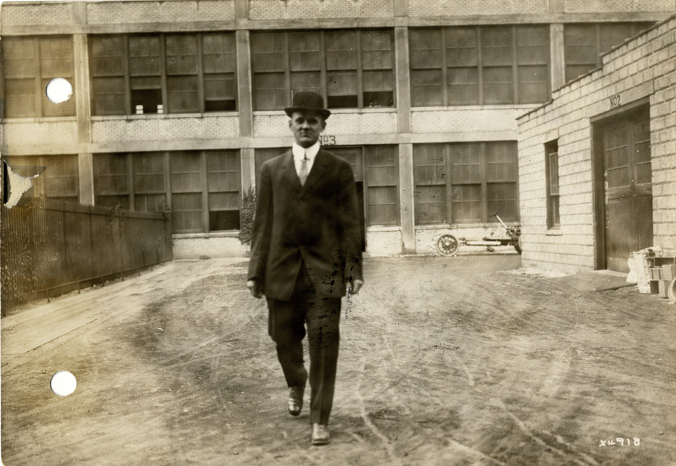 View of Mr. Parrett, of Wenona, Illinois, agent for Chalmers, posing in front of the Chalmers Motor Company factory. Handwritten on back: "Parrett, Wenona. Chalmer's agent at plant. Factories--Chalmers, 1915."