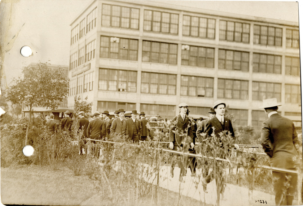Men standing outside Chalmers Motor Company factory, Chalmers Motor Company convention