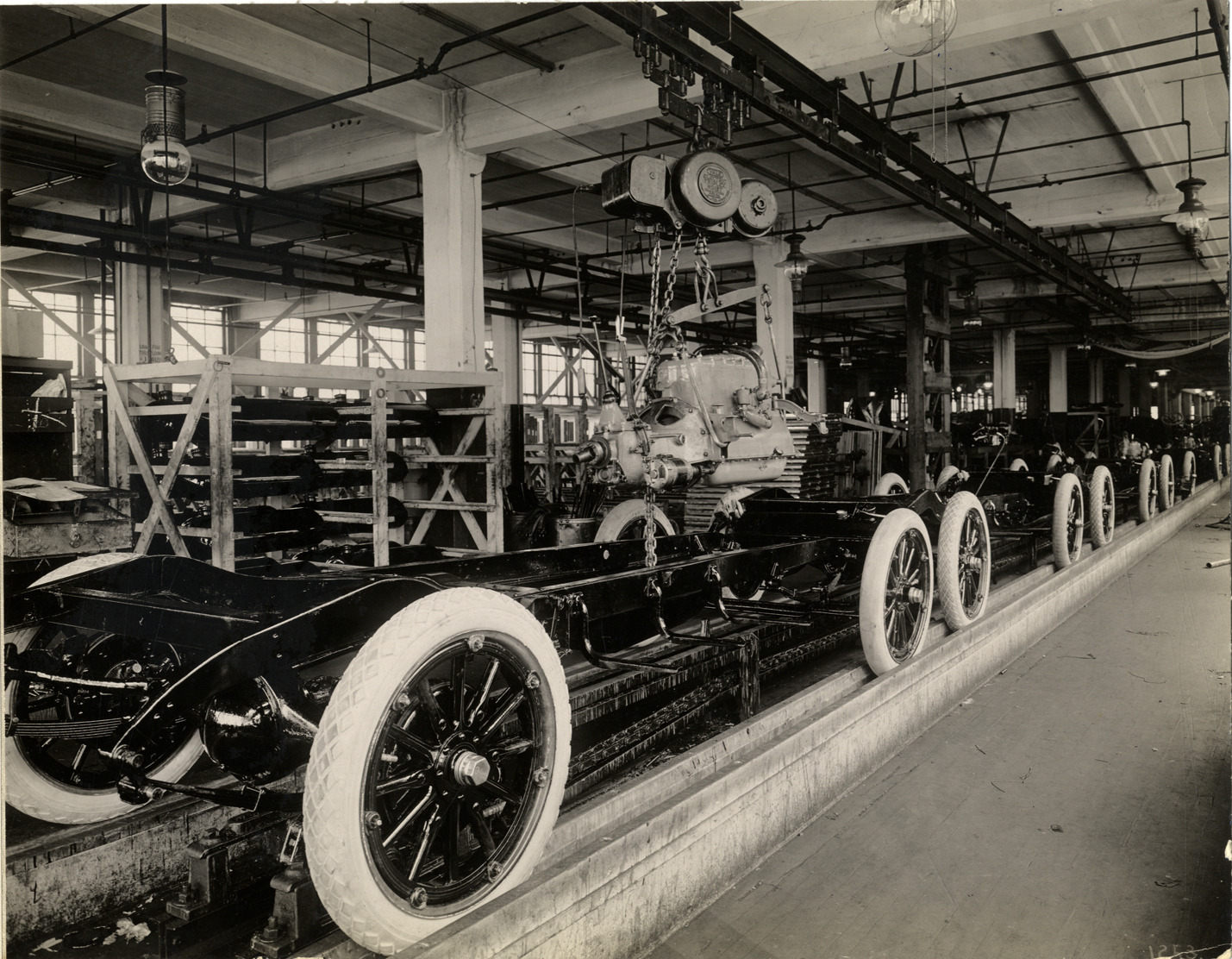 Favorite this☆ Engine being lowered onto automobile chassis, Chalmers Motor Company factory Description: View of an engine being lowered onto a car chassis at the Chalmers Motor Company factory. Typed on back: "Placing motor on chassis. Chalmers plant." Details Resource ID: na034077 Subject: Automobiles--Motors Automobile--Chassis Chalmers Motor Company Automobile factories--Michigan--Detroit Photographic prints Date Issued: Unknown year Format: 1 photographic print mounted on fabric ; 7.5 x 9.5 in. Member of: National Automotive History Collection Filing Location: Factories--Chalmers Rights: Physical rights are retained by DPL. Copyright is retained in accordance with U.S. copyright laws.