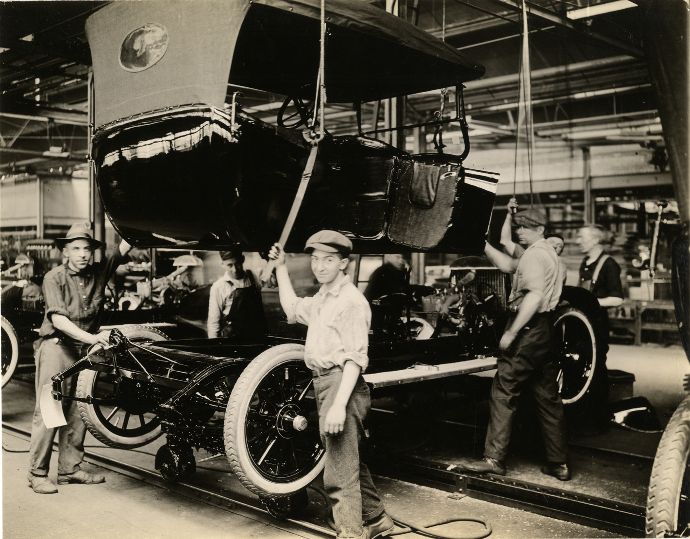 Favorite this☆ Workers lowering automobile body onto chassis, Chalmers Motor Company factory Description: View of men lowering a car body onto a chassis at the Chalmers Motor Company factory. Details Resource ID: na034098 Subject: Automobiles--Michigan--Detroit Automobiles--Chassis Automobiles--Bodies Automobile industry workers--Michigan--Detroit Chalmers Motor Company Automobile factories--Michigan--Detroit Photographic prints Date Issued: Unknown year Format: 1 photographic print mounted on fabric ; 7.5 x 9.5 in. Member of: National Automotive History Collection Filing Location: Factories--Chalmers Negative Number: 18211 Rights: Physical rights are retained by DPL. Copyright is retained in accordance with U.S. copyright laws.