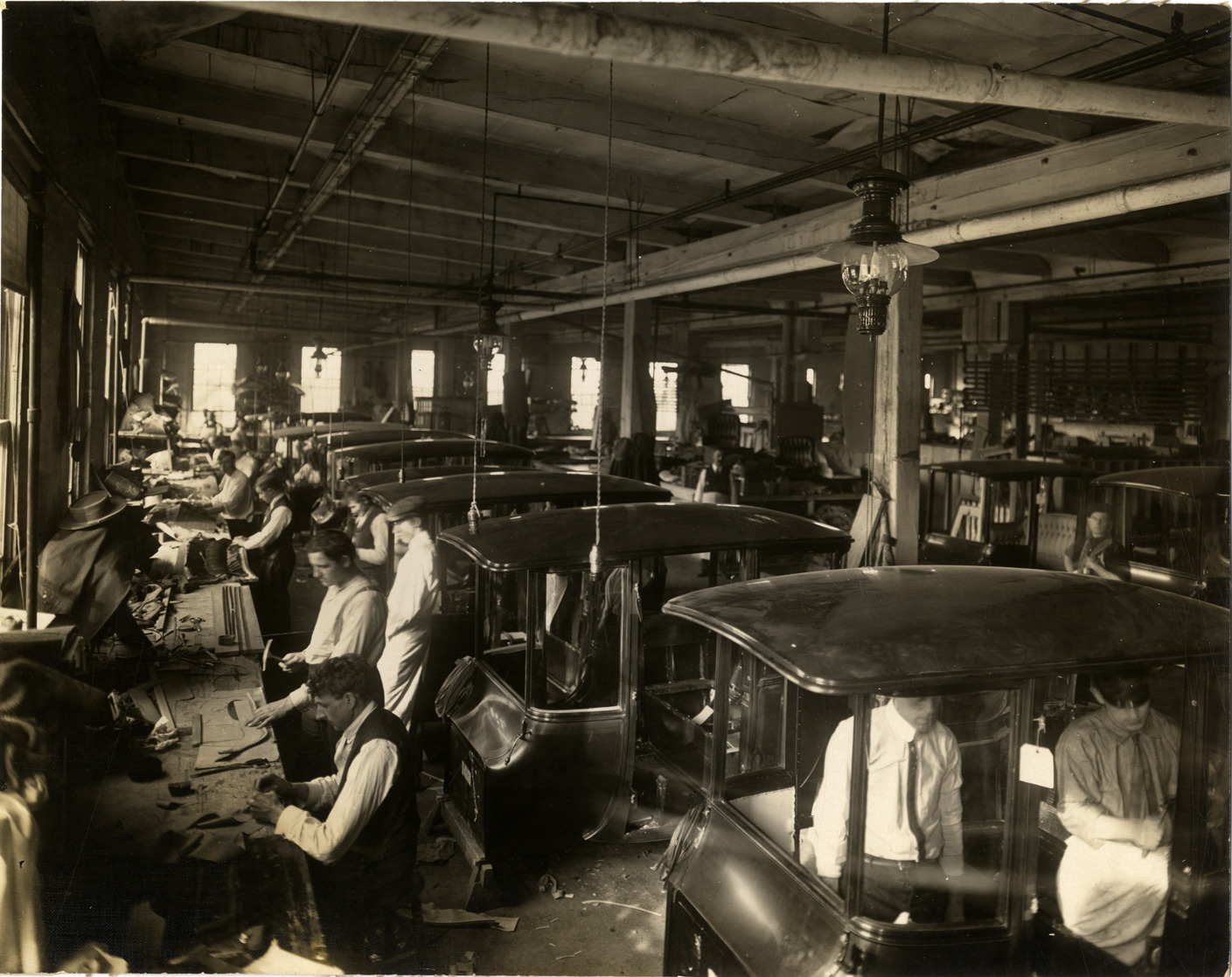 Favorite this☆ Workers assembling Detroit Electric automobile bodies Description: View of workers assembling Detroit Electric car bodies at the Anderson Electric Car Company factory. Typed on back: "Factories--Detroit Electric, 1912-13." Details Resource ID: na034145 Subject: Electric automobiles--Bodies Automobile industry workers--Michigan--Detroit Automobile factories--Michigan--Detroit Anderson Electric Car Company Photographic prints Date Issued: 1912 to 1913 Format: 1 photographic print mounted on fabric ; 7.5 x 9.25 in. Member of: National Automotive History Collection Filing Location: Factories--Detroit Electric Rights: Physical rights are retained by DPL. Copyright is retained in accordance with U.S. copyright laws.
