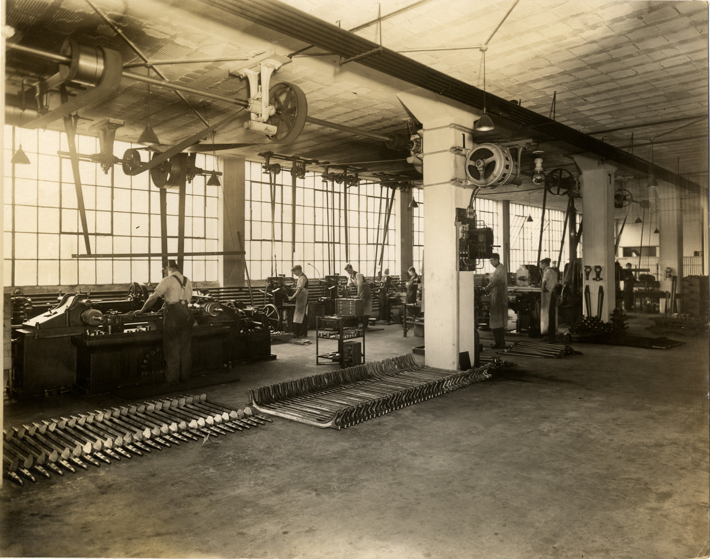 View of workers operating machinery to manufacture parts for Detroit Electric cars at the Anderson Electric Car Company factory. Typed on back: "Factories--Detroit Electric, 1912-13."