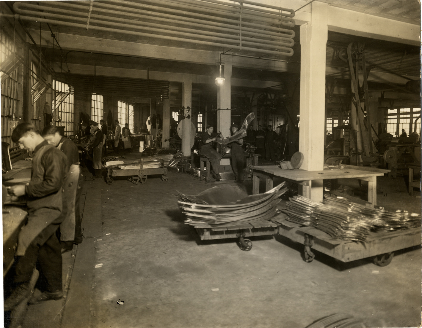 View of workers operating machinery to manufacture parts for Detroit Electric cars at the Anderson Electric Car Company factory. Typed on back: "Factories--Detroit Electric, 1912-13."