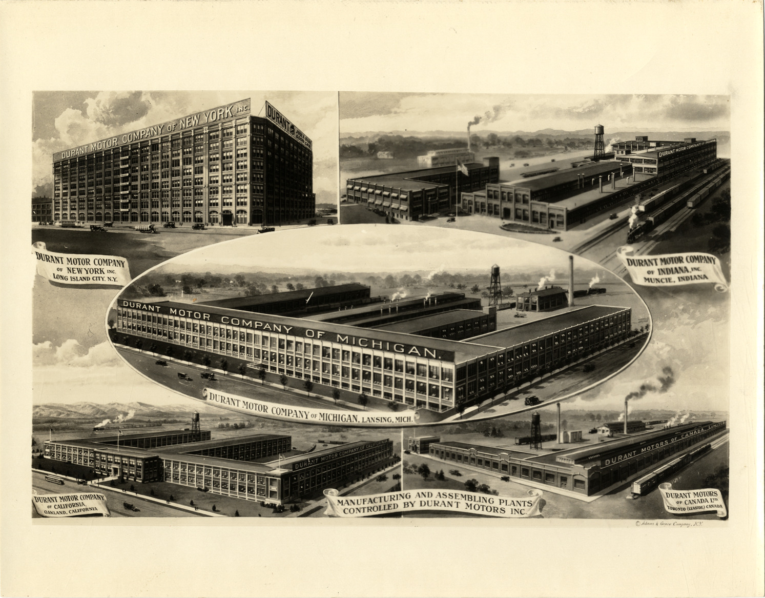 Artist's depiction of several Durant Motors factory buildings. Printed on front: "Manufacturing and assembling plants controlled by Durant Motors Inc. Durant Motor Company of New York, Inc. Long Island City, N.Y. Durant Motor Company of Indiana, Inc. Muncie, Indiana. Durant Motor Company of Michigan, Lansing, Mich. Durant Motor Company of California, Oakland, California. Durant Motors of Canada, Ltd. Toronto (Leaside) Canada. [copyright] Adams & Grace Company, N.Y." Handwritten on back: "Factories--Durant."